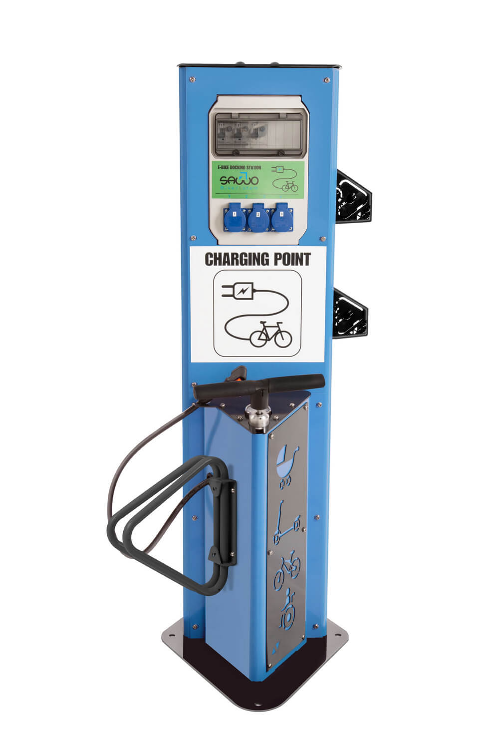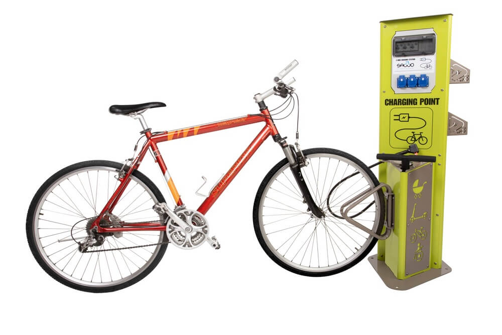 BM3025 Stacja naprawcza ładująca z wbudowaną pompką stacjonarną i stojakiem rowerowym. Ładowarka do rowerów E-bike.